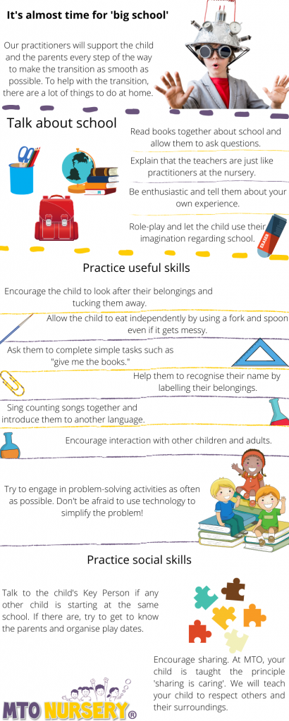 At story-time, our practitioners talk about ‘big school’ and encourage children to ask questions. We encourage parents to do the same at home to help children get used to the idea.